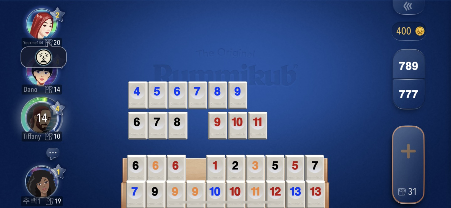 내가 못하는게, 아니라 자기 순서에 처음 세트를 내릴 경우 "등록" (initial meld)를 해야 되는데 반드시 타일 3개 이상의 숫자 합이 30이상 이어야 테이블에 내릴 수 있어. 난 이 판이 끝날 때까지도 그럴 수 없었던 거고.